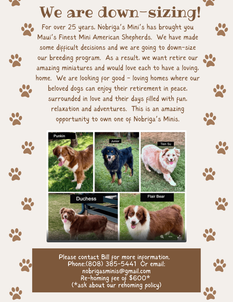 Nobriga’s Mini’s is proud to announce we have two puppies available next week and 5 more puppies available soon! We are also still looking for good homes for some of our adult dogs. See flyer below.