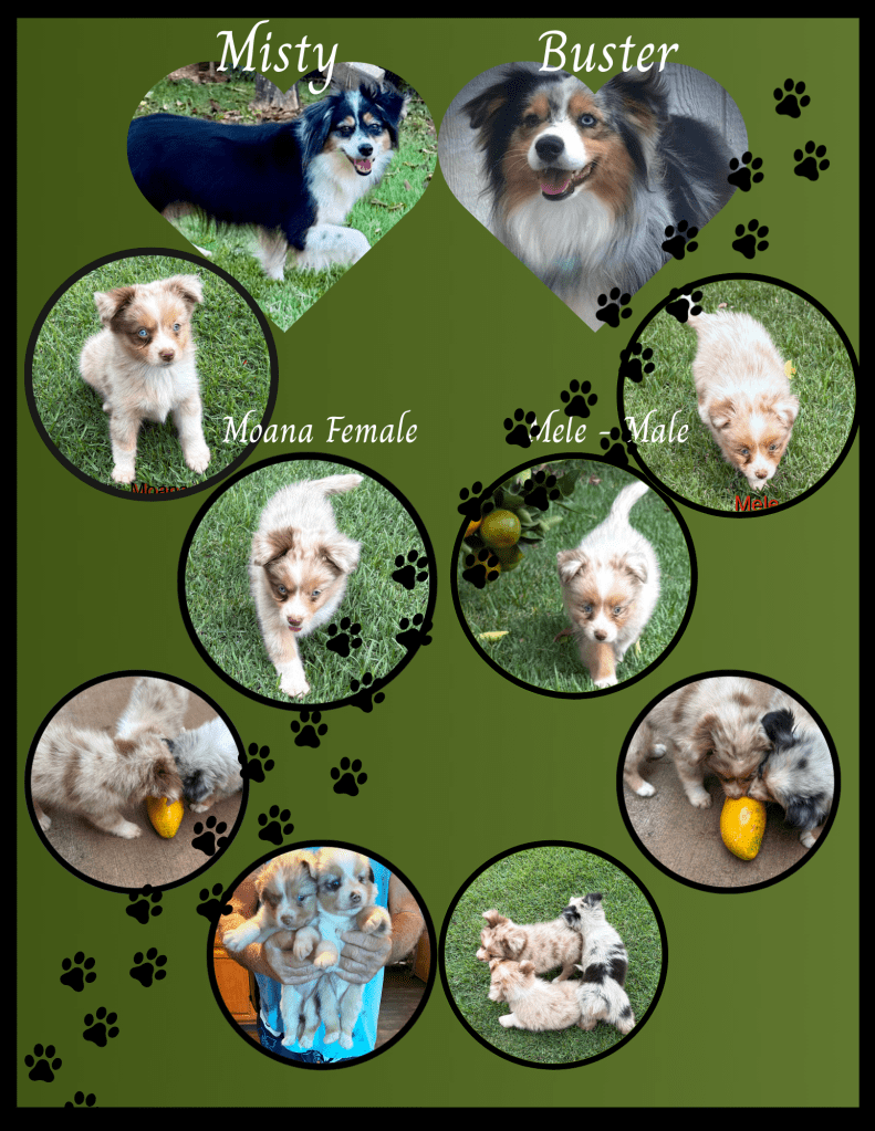 These two pups, we call Moana (Female) and Mele (Male) (but you can choose your own name) are available the first week in December. Please complete the Purchase Application and get it to Bill. These pups are Misty’s first and she has been a wonderful mother. Buster is also proud of his pups. These two are a lot of fun and you will enjoy their personalities.